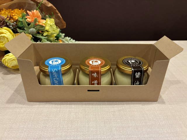 今回ご紹介するのは、なんと「塩・味噌・醤油」という和の調味料を主役にした「極生ぷりん専門店 ふじ」の「調味料3点セットぷりん」です。