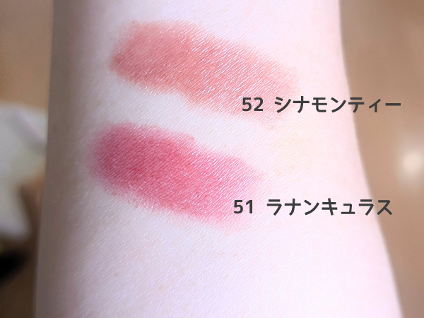 特に「シナモンティー」は、ベージュ系ながらも地味にならず、ナチュラルで色気のある仕上がりに!「ラナンキュラス」は、初心者にも使いやすい落ち着いたトーンの赤リップで、どちらもラメ控えめなので派手になりすぎませんでした。