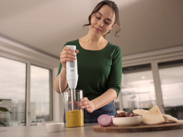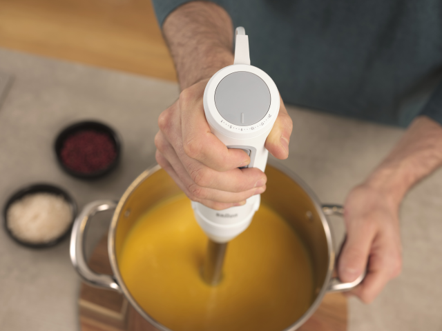 信頼のブラウンクオリティで、冷凍食材(半解凍)やかたい野菜もパワフルに撹拌。ハンドブレンダーをはじめて手に取る方でも扱いやすく、食材の仕上がりにしっかり差が出ます。