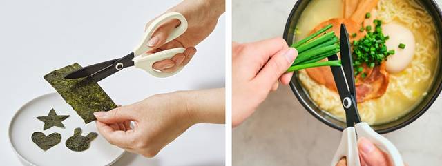 切るものをしっかり挟み込むギザ刃を採用することで、食品パッケージはもちろん、滑って切りにくい生ものや、昆布のような硬い食品も切りやすくなっています。また、あえて分解できない設計となっているため、不意に外れてしまうことがなく、キッチンハサミ初心者でも扱いやすく安心の仕様です。