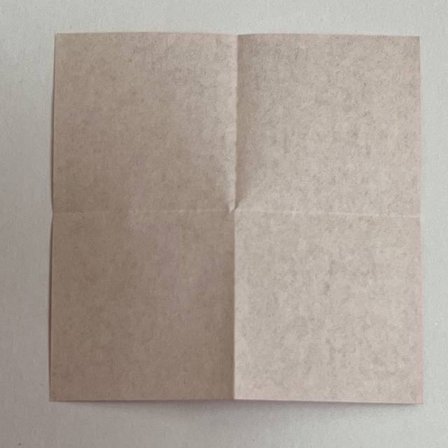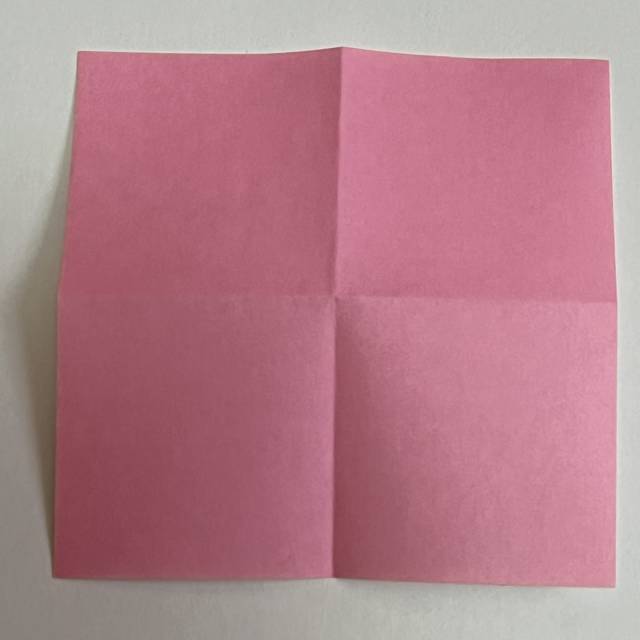 先ほどと同じように、四角く2回折って開き、十字の折り線を作ります。