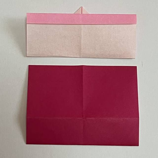 赤い折り紙をピンクの折り紙の中に差し込みます。