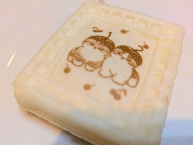 もちもちの皮がクセになるワッフル。焼印は全10種類で、オリジナルシールが1枚付いています(全12種類・ランダム)。