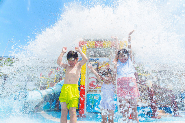 水深わずか10cm!小さなお子さまでも安心して楽しめる夏季限定のエリアです。レゴ® ブロックのような滑り台やシャワーなど、楽しい仕掛けが盛りだくさん。