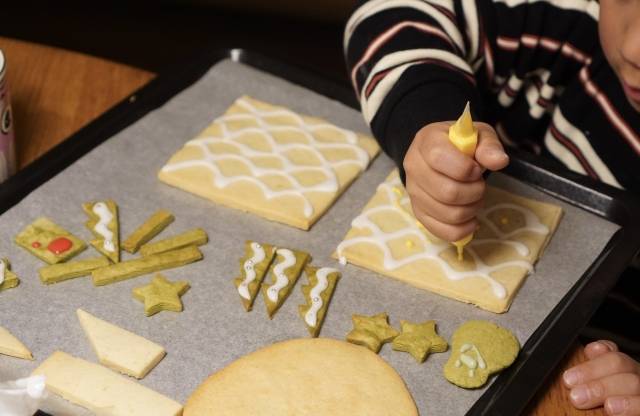 プレーン、ココア、抹茶の3色のクッキーパーツ、アイシングパウダー、絞り袋、サンタの砂糖菓子がセットになっています。アイシングをつくり、クッキーを組み立てお好みのデコレーションをすれば、手軽にヘクセンハウスが作れちゃいます。