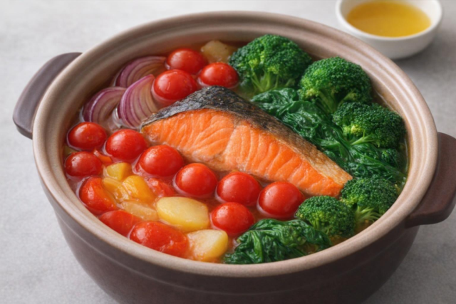 やさしい和風出汁に、アスタキサンチン豊富な鮭、ビタミンCたっぷりのブロッコリーを合わせた一品。ゆずの香りがアクセントに。昆布だしで素材の旨みを引き出し、リコピン・ビタミンE・アスタキサンチンをバランスよく。