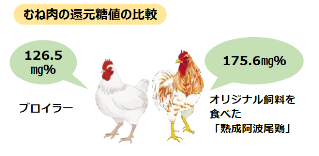 エサには「木酢液(もくさくえき)」をしみこませたオリジナル飼料を与えることで、ブロイラーと比べて獣臭さも少なく、おいしさの指標である『還元糖値』が1.4倍も高いことが分かっています。