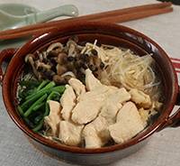 ① 鶏肉は薄くそぎ切りにする。えのき茸は石づきを取り、2等分にし、しめじは小房に分けほうれん草は 5㎝長さに切る。