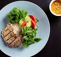 ⑤ 炊き上がったジャスミン米を器に盛り、食べやすい大きさにカットした阿波尾鶏をのせパクチー、お好みの野菜(トマト、胡瓜、レタス)を添える。