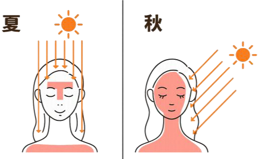 さらに秋は太陽の位置が低くなるため、紫外線量は夏より少なくても、斜めから光が降り注ぐことで顔だけでなく首までも日焼けしやすくなります。