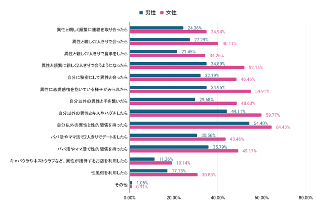 「浮気と考える選択肢を男女別割合で表示したグラフ」が示す通り、浮気に対する認識には男女で大きな差があることが判明。すべての選択肢において、女性の方が男性よりも「浮気」と認定する割合が高くなっています。