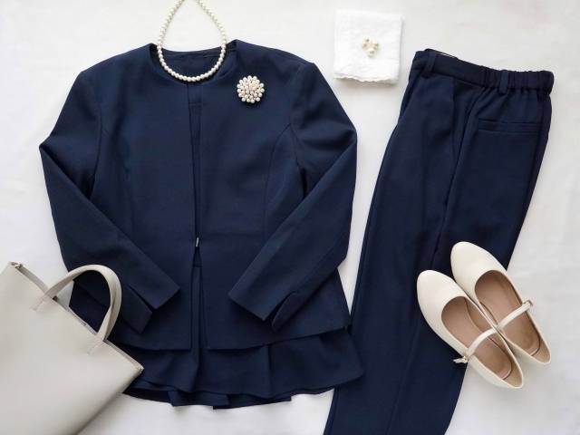 ジャケット+おしゃれブラウス+動きやすいパンツスーツが素敵な大人のオケージョンコーデ。