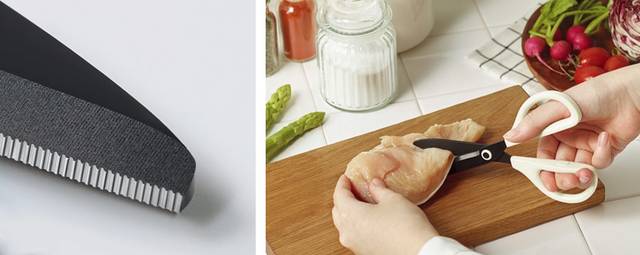 切るものをしっかり挟み込むギザ刃を採用することで、食品パッケージはもちろん、滑って切りにくい生ものや、昆布のような硬い食品も切りやすくなっています。また、あえて分解できない設計となっているため、不意に外れてしまうことがなく、キッチンハサミ初心者でも扱いやすく安心の仕様です。