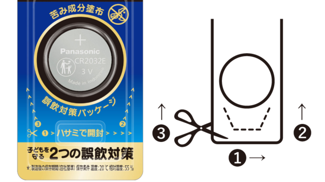 安全性を考えたパナソニック エナジー独自の誤飲対策パッケージを採用。小さなお子さんが誤って開けてしまったり、そのまま飲み込んでしまったりすることを防ぐため、手では開けられない工夫が施されています。